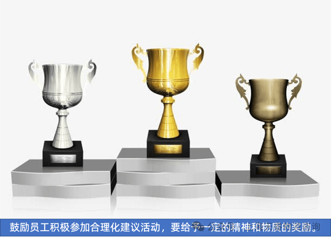 **鼓励员工积极参加合理化建议活动,要给予一定的精神和物质的奖励。**对奖励要特别注重及时性,只有及时性,才会产生鼓励的效果。而一些企业会每年进行一次合理化建议表彰大会,这样的及时性就差了。而搞得好的企业往往是一个月或一个季度汇总表彰一次,这样的效果比较好。对于经济效益特别好的建议,在实施后,要专门开会给予表彰。对员工本人和他人将是一次冲击力很大的激励。