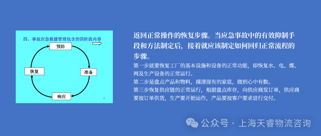四、返回正常操作的恢复步骤。当应急事故中的有效抑制手段和方法制定后,接着就应该制定如何回归正常流程的步骤。恢复步骤的第一步就要恢复工厂的基本设施和设备的正常功能,即恢复水、电、煤、网及生产设备的正常运行。**第二步是盘点产品和物料,**摸清现有的家底,做到心中有数。第三步恢复供应链的正常运行,根据盘点库存,向供应商发订单,供应商要按订单供货,生产要开始运作,产品要按客户要求进行交付。在恢复过程中,工作可以分部门职能同步进行,如在修复设备的同时,可以告诉供应商做好发货的准备。通知客户,产品何时可以交付等。