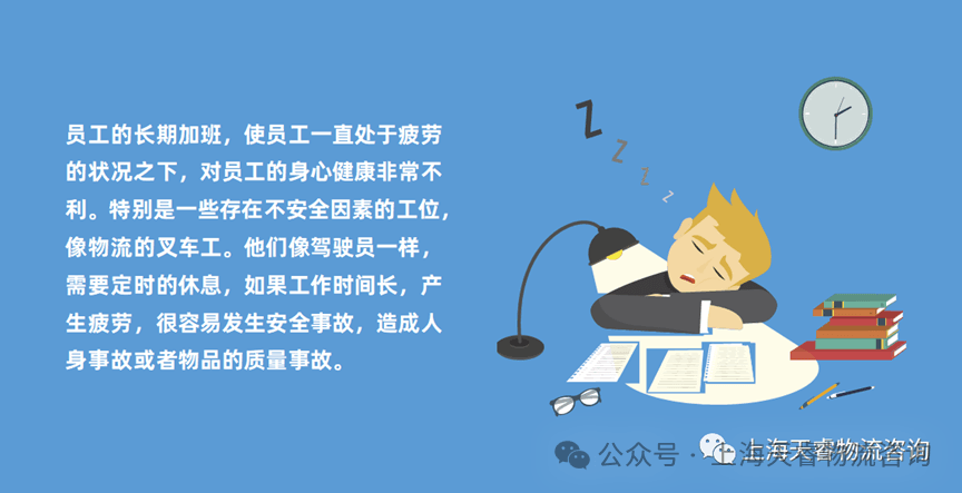 三、员工的长期加班,使员工一直处于疲劳的状况之下,对员工的身心健康非常不利。特别是一些存在不安全因素的工位,像物流的叉车工。他们像驾驶员一样,需要定时的休息,如果工作时间长,产生疲劳,很容易发生安全事故,造成人身事故或者物品的质量事故。因此,加班只能作为一个平衡劳动力的短期措施,绝不能成为企业的风气。