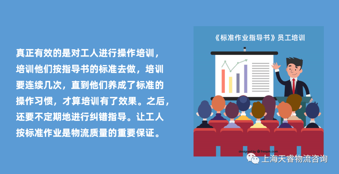 由于物流的环节和工作类型比较多,在物流实际操作上,还有大量的作业指导书。这些作业指导书起着重要的作用,它的编制需要供应链工程师、质量工程师和操作工人的合作,共同编制的指导书既有可操作性,又能保证工作和物品的质量。对作业指导书的培训通常是张贴在作业区里,实际上一种形式主义,极少有工人上班去看指导书。真正有效的是对工人进行操作培训,培训他们按指导书的标准去做,培训要连续几次,直到他们养成了标准的操作习惯,才算培训有了效果。之后,还要不定期地进行纠错指导。让工人按标准作业是物流质量的重要保证。