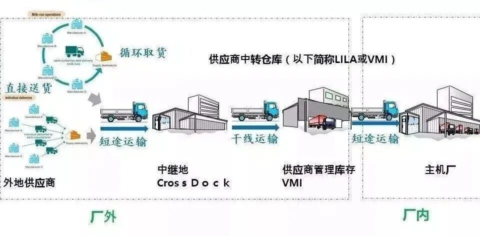 在工厂外部,一般情况下,供应商是自己或者委托第三方物流公司把物料送到工厂。送的量根据最小批量和生产需求而定,虽然能够满足生产的需求和维持库存的水平,但往往卡车的满负荷装载就难以得到保证,也就是说库存的节约是由装载的浪费来获得的。**通过精益物流的思考,受到送牛奶过程的启发,产生了循环取货运行。即用一辆卡车每天一次或数次上门到供应商处进行取货,每次取货的量以满足一段时间生产需求,满足库存的维持,也同时满足卡车的满负荷装载量,达到满足产线客户需求的同时,物流成本实现最精益化。**循环取货不但可以用在取货上,也可以同样用在送货上。不但可以用在正向物流上,也可以用在逆向物流上。取货时可以把空容器带给供应商,使得来回运输都得到了装载量的满足。