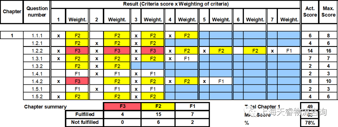 MMOG/LE完整版的197个标准对评估供应链绩效和供应链能力都非常重要,但标准与标准间重要程度却有所不同。权重最高的标准(F3=3分),最基本的供应链运作要求,如果没有达到这些标准,就会存在风险和隐患。权重较高的标准(F2=2分),可以有效控制供应链运作,并影响供应链运作的效率和质量。权重一般的标准(F1=1分),能够优化供应链,并为企业带来额外的竞争力和长期的稳定性。