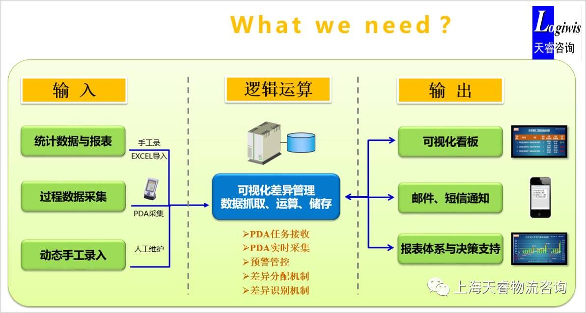 下图是某企业通过软件输入/采集的各物流环节实时数据,将实时数据与量化的物流标准数据进行逻辑运算,从而输出实时差异通知,并及时的提供决策支持,形成可视化的差异管理。