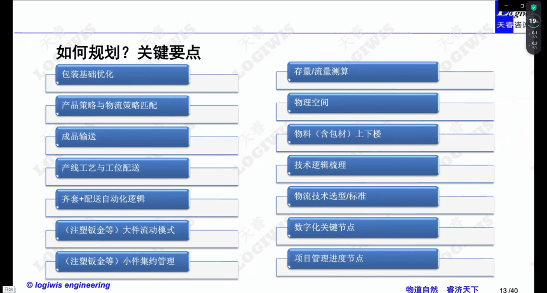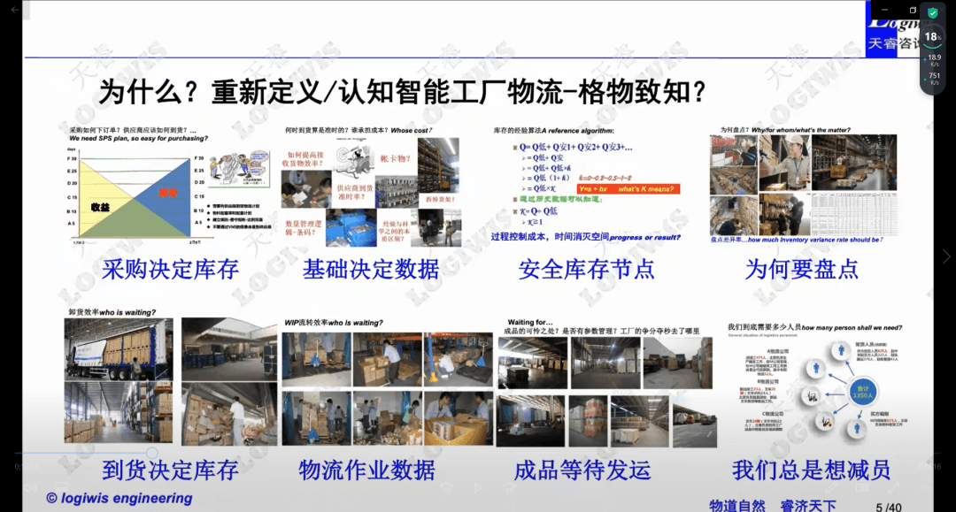 2023年8月 7日,上海天睿物流咨询有限公司总经理邱伏生先生,受邀参加由深圳市工业互联网协会主办的“2023年智能制造与工业互联网“系列公益联播课,2023年系列公益课主题为”智改数转 产业协同 相向而行”。本次公益课中,邱伏生老师发表了《以物流为主线做好智能工厂规划》课题分享,从为什么要重新定义/认知智能工厂规划、如何规划智能工厂-规划智能工厂的逻辑与方法论、智能工厂有哪些最佳实践、智能工厂规划总结与展望4个方面展开了精彩的讲解,以下为部分关键内容节录。