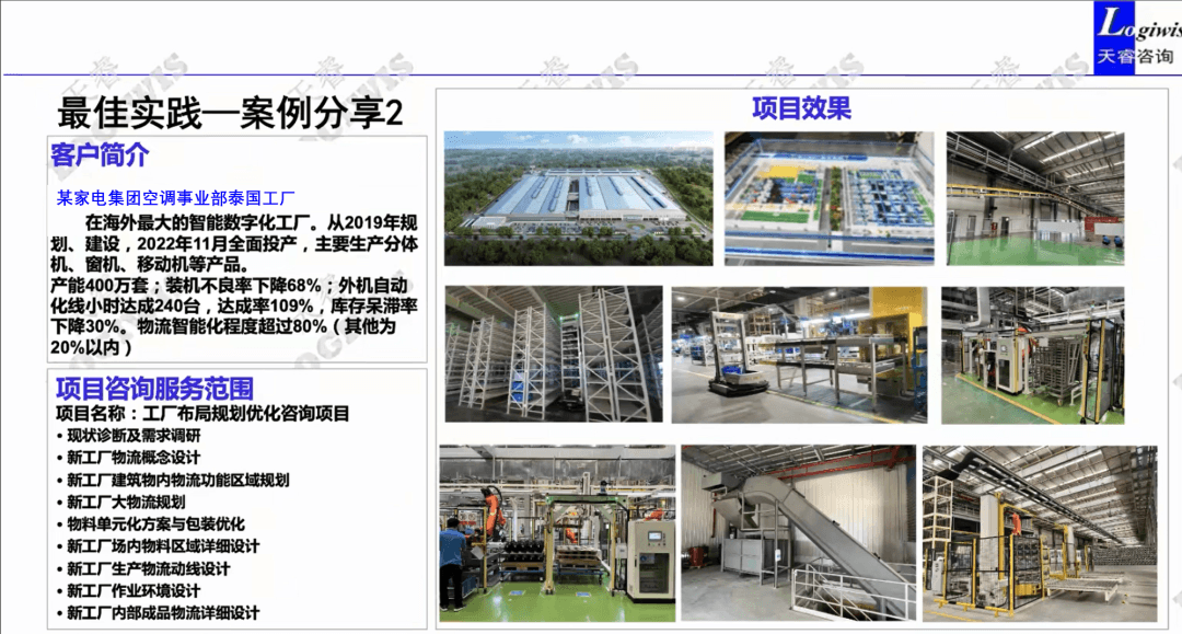 案例2:某家电集团泰国空调工厂,亮点:1、物流主线自动化80%,同行20%以内;2、产能相较同行高出50%。