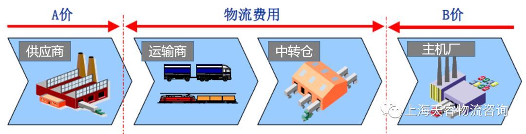 在这里先引入一个概念,A/B价。一般定义供应商物料出厂的价格为A价,供应商物料送达主机厂卸货口的价格为B价,则供应物流成本就等于B价-A价。在绝大多数的家电企业以及小部分的汽车企业,入厂物流的模式目前采用的仍然是供应商自行组织送货,基于此种物流模式,采购价格采用的是B价,其物流成本也多是不能体现在其采购价格上的,即便有体现,也多是未经过认真核算的。因为有的企业对于零部件的采购是通过招标的方式(多是采用最低价中标的方式),其只关注物料的总价格,而供应商为了有利可图,就会从物流上缩减支出,这样导致的后果便是入厂物流混乱,主机厂推动的入厂物流改善也难以实施。(对于造成这种现状的原因本文不做过多讨论,以下只从物流成本的构成和物流成本分离/剥离方面展开。)