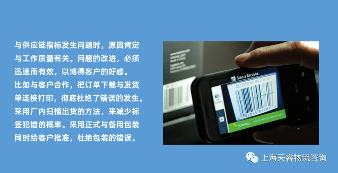 供应链指标发生问题时,原因肯定与工作质量有关。问题的改进,必须迅速而有效,以博得客户的好感。我们的主要客户订单号有11位,电脑下载打印后,靠手工填写在发货单上,而且需要工程师在办公室与工人在仓库进行两次填写,经常出错。经过培训和协调,把订单的下载打印放到了发货仓库里操作,减少了一次填写,犯错频率立刻大幅度下降。之后,又继续改进,与客户合作,把订单下载与发货单连接打印,彻底杜绝了错误的发生。采用厂内扫描出货的方法,来减少标签犯错的概率。采用正式与备用包装同时给客户批准,杜绝包装的错误。
