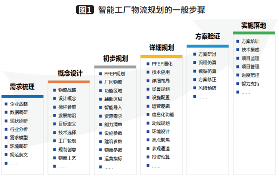 智能工厂物流规划是一个系统规划的过程,需要遵循一定的步骤。图1所示为智能工厂物流规划的一般步骤,包括需求梳理、概念设计、初步规划、详细规划、方案验证等阶段。