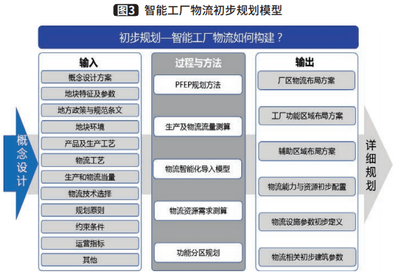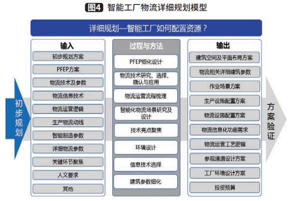 规划的最终目的是落地运营,因此本阶段的关键是,通过细化设计的PFEP,对物流技术进行研究、选择、确认及应用,对物流流程进行梳理、对智能化物流场景开展研究及设计、对环境进行设计、选择信息技术并对建筑参数进行细化等,最终输出详细规划方案,具体到每一个物料、每一个工位和每一平方米的方案细化,并在此基础上配置资源,进一步确保方案落地。智能工厂物流详细规划模型,如图4。