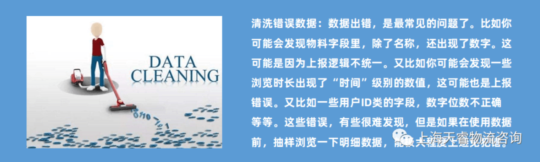 **6、清洗错误数据:**数据出错,是最常见的问题了。比如你可能会发现物料字段里,除了名称,还出现了数字。这可能是因为上报逻辑不统一。又比如你可能会发现一些浏览时长出现了“时间”级别的数值,这可能也是上报错误。又比如一些用户ID类的字段,数字位数不正确等等。这些错误,有些很难发现,但是如果在使用数据前,抽样浏览一下明细数据,能极大程度上避免犯错。