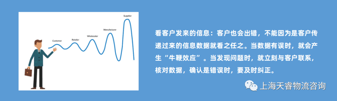 **2、看客户发来的信息:**客户也会出错,不能因为是客户传递过来的信息数据就看之任之。当数据有误时,就会产生“牛鞭效应”。当发现问题时,就立刻与客户联系,核对数据,确认是错误时,要及时纠正。
