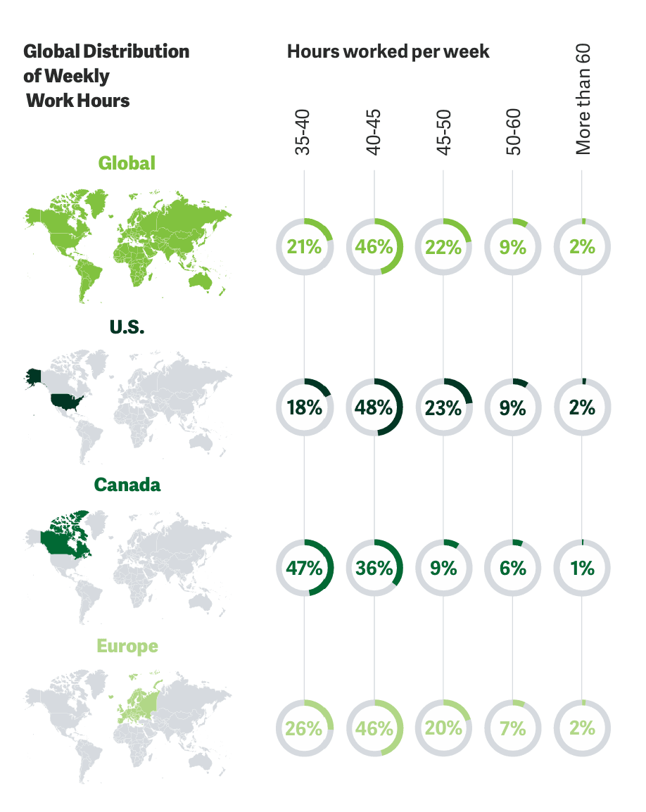 在美国,66% 的受访者每周工作 45 小时或更少;而在欧洲,这一比例为 72%。总计只有 11% 的人每周工作超过 50 小时(约每天加班超2小时)。