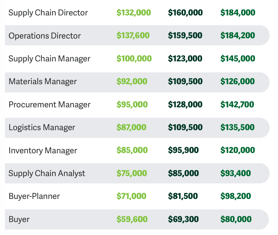 这排名乍一看有些失望,感觉是废话。供应链总监、运营总监属于收入最高的人群,其薪资中位数约为 16 万美元。接下来,各类供应链职能经理的薪资中位数在 10.9 万至 12.8 万美元之间。库存经理和物料经理的薪资分别为 9.6 万美元和 11 万美元。而采购员等初级岗位、采购计划等分析师职位,薪资中位数在 6.93 万至 8.5 万美元之间。