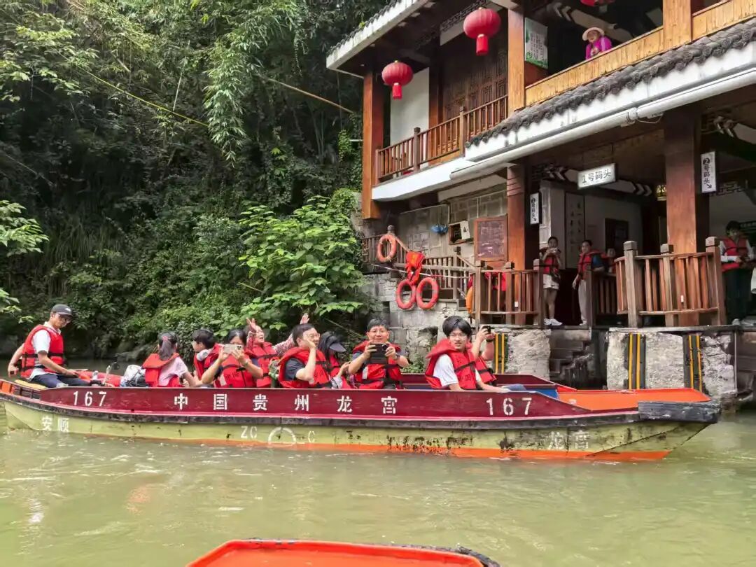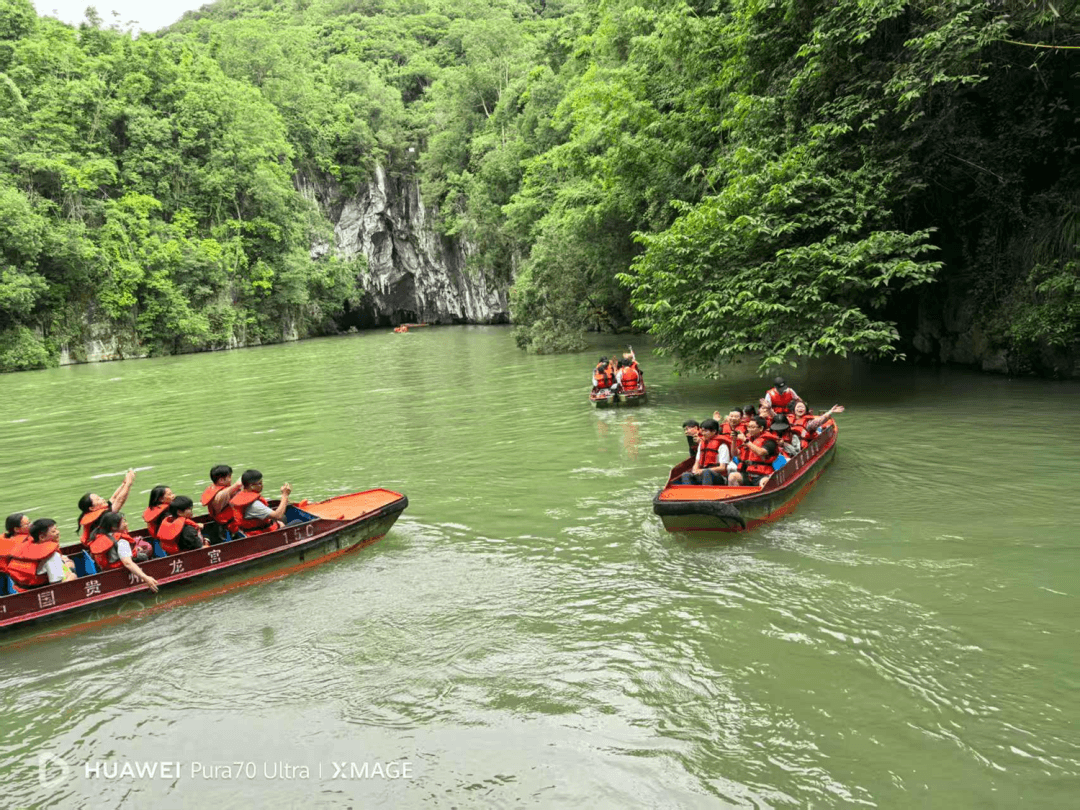 团建 6:探秘安顺龙宫,乘舟穿暗河,看钟乳石幻化龙宫。抚亿年石幔,听 “龙王爷” 传说,于 “龙宫” 匾额下合影,留存地心奇观。