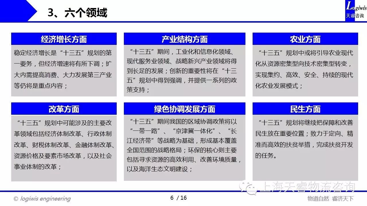 “十三五”规划聚焦经济增长、产业结构、农业、改革、绿色协调发展及民生六大领域,强调调结构、转方式、促创新。多个行业“十三五”规划已基本完成,预计将在十八届五中全会后陆续公布。该规划标志着中国从高速增长向高质量发展转型的关键政策布局。