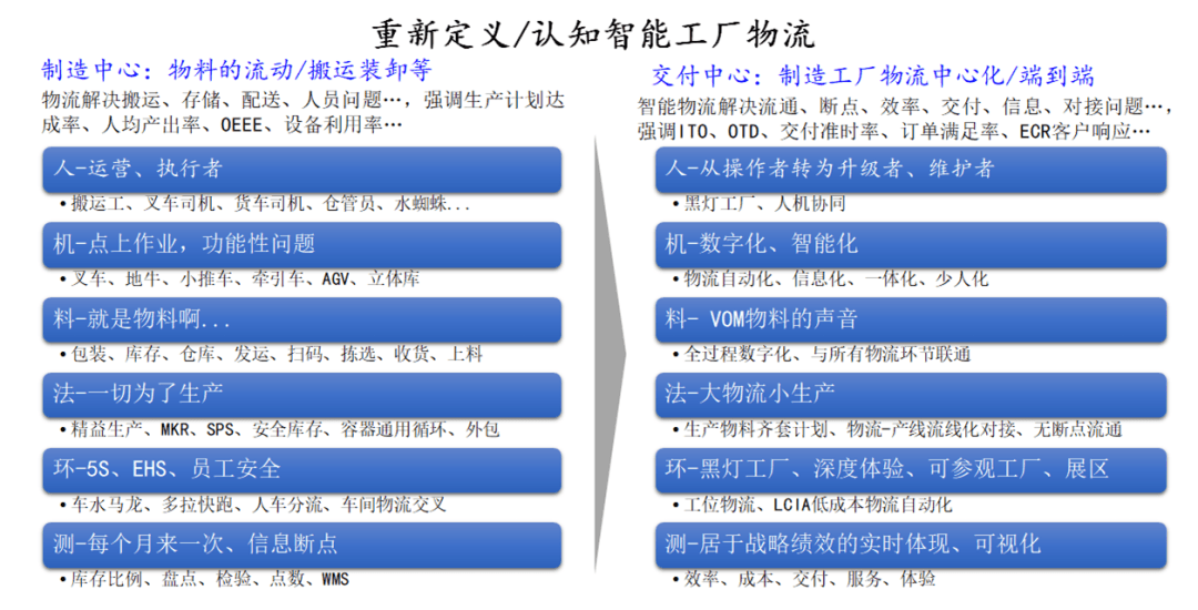 传统工厂物流与智能工厂物流在人、机、料、法、环、测等方面的表现差异如图1所示。