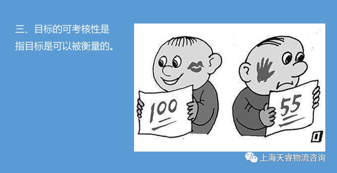 **三、目标的可考核性是指目标是可以被衡量的。**例如:交付及时率,是一个量化的,可考核的目标。属于量化的目标就应该有相应的条件和统计公式。交付及时率是按顾客订单要求的时间、数量和地点完成的交付才算合格。在文件中还要写上统计的公式来衡量目标是否达成。考虑到目标考核的公正性,本部门的目标完成情况的统计由基层操作工或者相关部门进行统计,而不是由目标承接人自己来统计。如交付,每次由发货工人将顾客订单与交付的时间和数量进行匹配,发货后把数据输入系统,或者直接扫描出货并同时输入系统,作为交付的记录。到月底由系统自动生成交付及时率。同样,库存的金额、物品的数量、物流的费用都是由财务部门从财务系统里调出来,提供给承接部门与目标相对照。