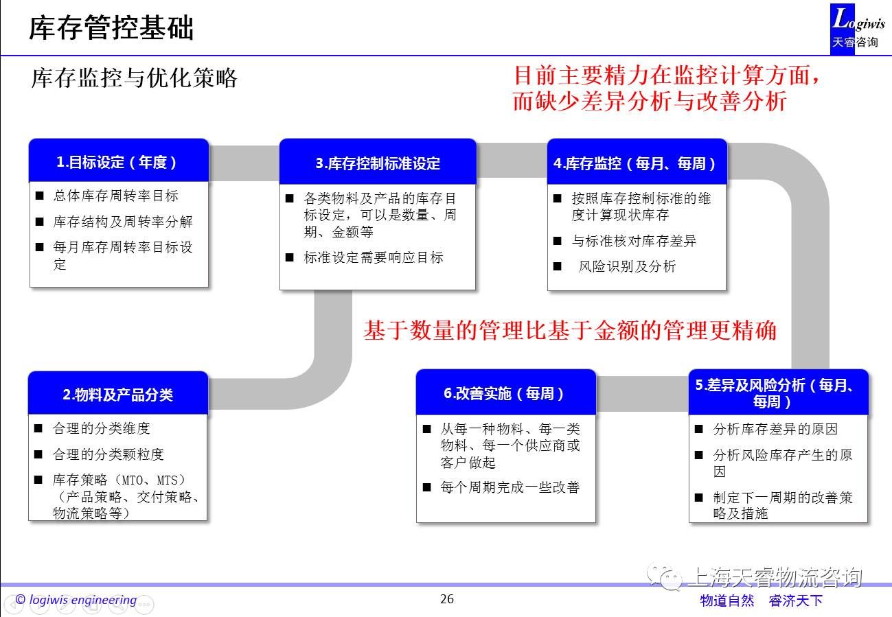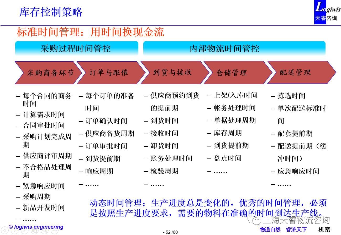 库存控制的关键是时间管控,时间的长短决定了供应链上的库存,**整个过程包括“采购-到货-验收-仓储-分拣-配送-生产-成品入库-存储-开单备货-装车-发运-接收”,都应该进行精确的时间管控。**对于公司而言,公司供应链体系决定了流程模式,流程决定时间,时间决定供应链上的库存,库存决定空间和成本。因此,在既定的组织结构和流程的前提下,时间管理是供应链管理、库存控制的主要突破口。通过对物流各个环节的时间管理和控制,可以有效的对整个物流过程的速度、效果、能力进行管控,同时,通过各个物流环节的快速响应,最终体现为供应链上的库存、搬运、等待等各种浪费大幅减少,并降低物流运作过程的风险。