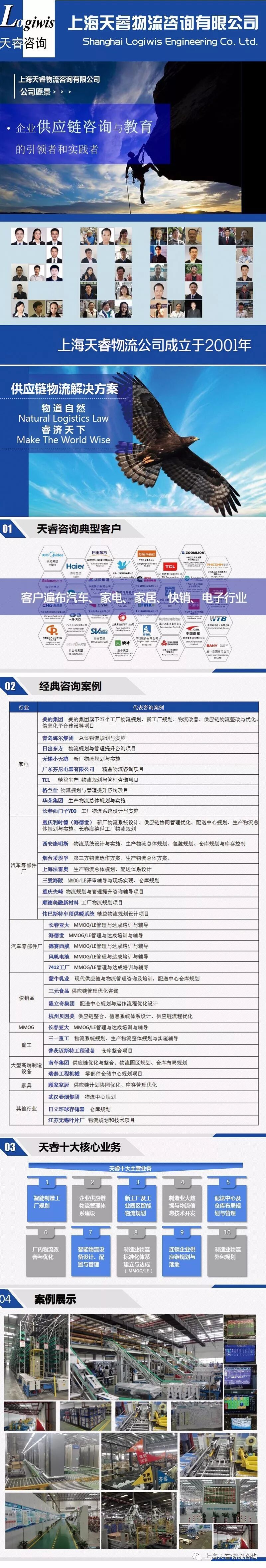 上海天睿物流咨询有限公司成立于2001年,是面向企业物流规划与供应链咨询的国内领先的专业公司,公司始终致力于企业物流管理咨询和培训、工业4.0与中国制造2025规划、物流与供应链管理体系建设、制造业大数据与物流信息技术与管理、MMOG/LE达成&SIOP体系建设与实施、新工厂及工业园区智能物流规划、精益生产与精益物流导入落地推进、厂内物流管理咨询与规划、智能物流设备设计、配置与管理、连锁企业供应链战略与运作优化,向企业提供空间规划、物流管理的全面解决方案。
