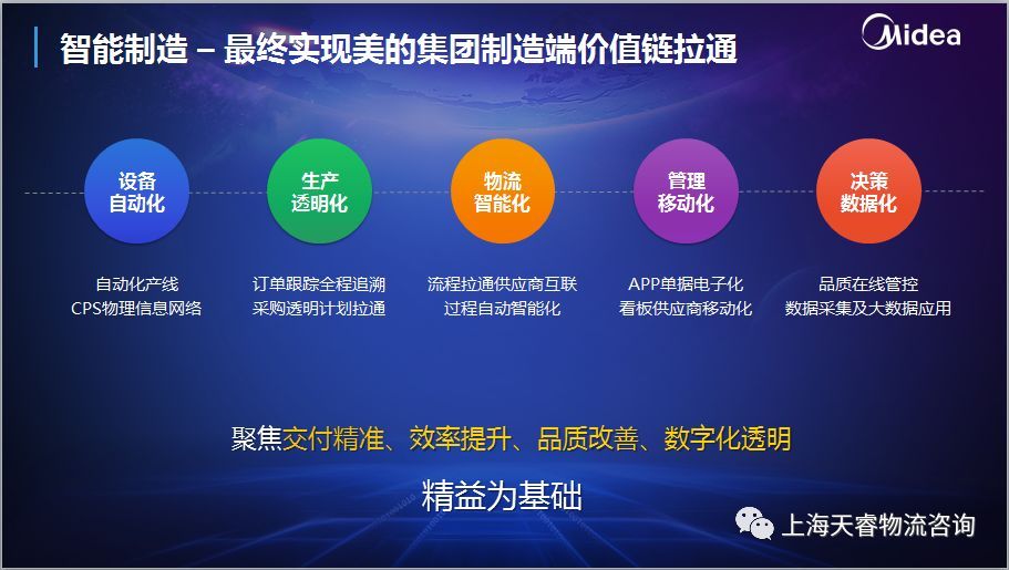 · **智能制造将最终实制造端价值链的拉通,**美的集团此过程以精益为基础,聚焦交付精准、效率提升、品质改善、数字化透明,最终实现设备自动化、生产透明化、物流智能化、管理移动化、决策数据化。