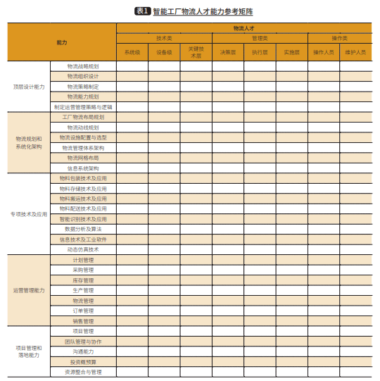 智能工厂物流人才需要具备架构、建设、使用、维护、优化智能工厂物流系统的能力,需要能够接受和使用新的理念、方法、技术和工具,能够系统性规划智能工厂的物流系统,能够运营智能工厂以达成交付、周转、盈利等方面的战略绩效,并逐步实现其数字化、智能化的迭代升级。作为智能工厂的物流人才,需要“懂技术、懂运营、懂规划、懂数据、懂应用”(精通其中一个或者多个方面),具体而言,需要具备顶层设计能力、物流规划和系统化架构能力、专项技术能力、运营管理能力、项目管理和落地能力等,如表1所示。