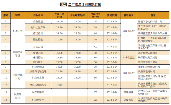 工厂物流计划是以生产作业计划为拉动,基于各个环节的作业规范和标准,倒排各个节点上的物流计划,安排合理的开始时间和结束时间,由此才能进行各个物流环节的协同运作和差异管理。工厂物流计划需要设定不同物流环节的时间容差(精度),比如工位配送需要精确到“分钟”,物料的库存计划、物料到货计划精确到“小时”或“天”,检验计划、卸货计划、装车计划等精确到“小时”或“分钟”,供应生产精确到“天”等,从而定义物流计划的精确度,并设定差异识别的灵敏度。