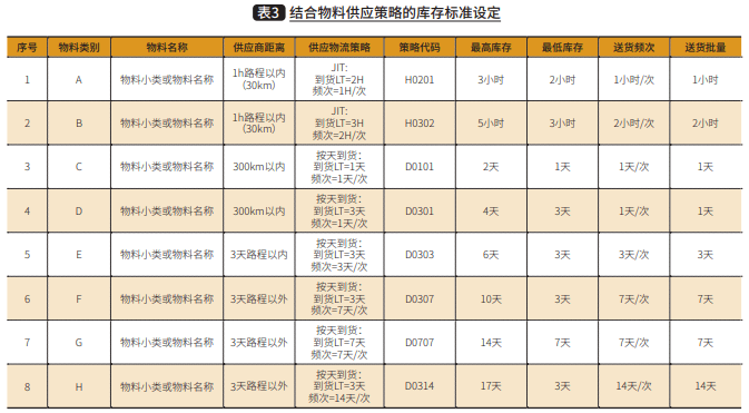 原材料库存取决于采购批量和供应商到货周期(或者采购周期),同时与质量合格率、供应商送货的稳定性等变数相关,是采购、入厂物流、生产、物料齐套等计划与执行的结果。物料供应策略决定了库存标准的设定:首先,供货距离是物料可得性的主要因素之一,供货距离越远,物流的提前期越长,则库存标准越高;供货距离越近,物流的提前期越短,则库存标准越低。其次,物流量越大,供货的频次越高,库存标准就可以偏低;物流量越小,频次越低,库存就需要略高。工厂有了基本的物料供应策略规划后,针对每一种物料匹配合适的供应策略,同时将形成每一种物料的库存标准,如表3所示。