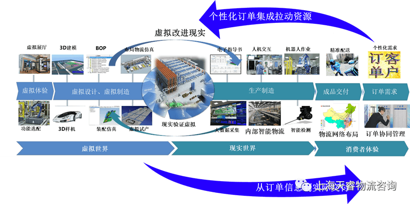 对于面向订单生产MTO(maketo order)的产品,往往个性化要求比较高,需要根据在线订单要求,进行产品虚拟设计、研发或者个性化优化,然后进行智能化采购、到货、分拣和智能化配送到工位、智能制造装配、成品打包和下线装车发运,直到配送到客户或消费者手上。比如在线个性化制造等,其原材料、制造、交付是严格对应的,往往需要保证过程的一致性和可追溯性。