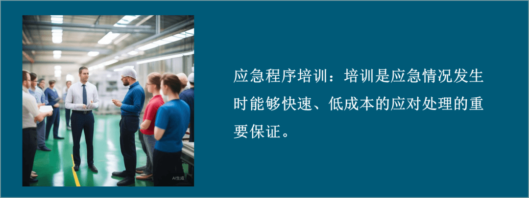 **应急程序培训:培训是应急情况发生时能够快速、低成本的应对处理的重要保证。**关于应急程序的培训需作为工厂培训中的一个重要部分。对应急预案的实施各环节涉及人员需要进行定期培训、考核,使其充分掌握应急预案知识、流程,如果有条件的,可以针对某些预案进行不同程度的演习(如消防演习)。培训的过程也是不断宣导与强化应急物流管理的意识,工厂全员都要有这种应急的理念。