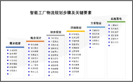 - 智能物流要素方案细化:根据选定的场景,细化智能物流要素导入方案,包含场景区域规划、与上下工序的衔接、智能物流技术与设备选取、投资收益等。